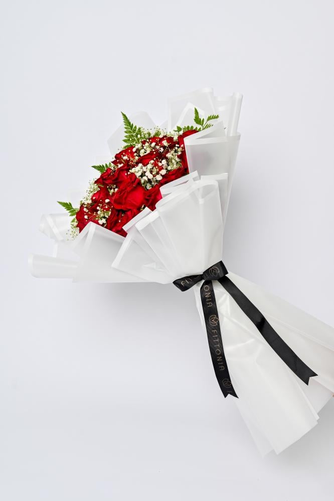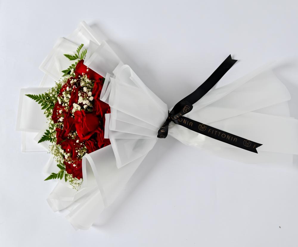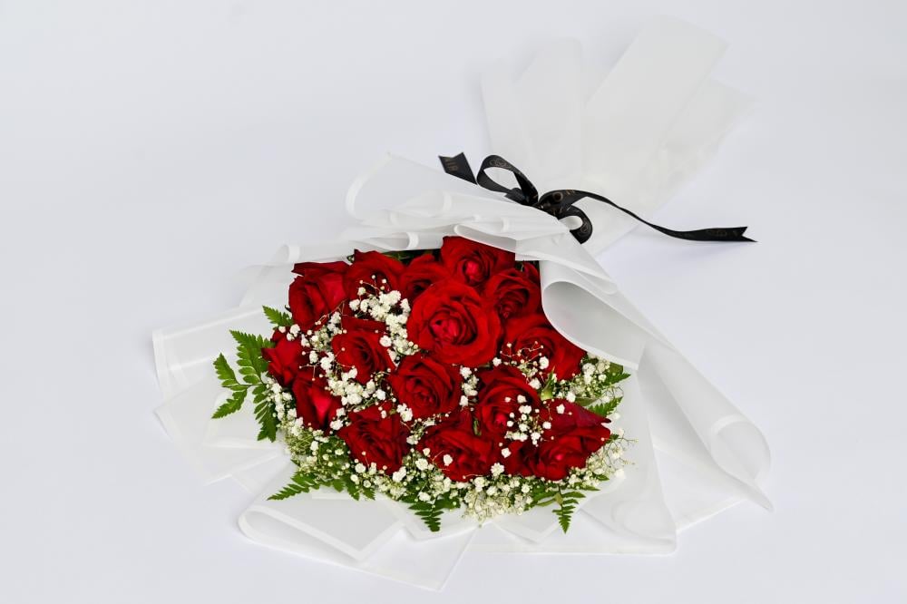 • محتويات الباقة: الورد الجورى الأحمر : 15 وردة - تغليف ابيض شفاف